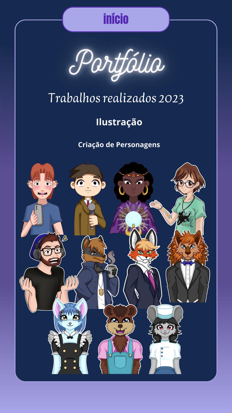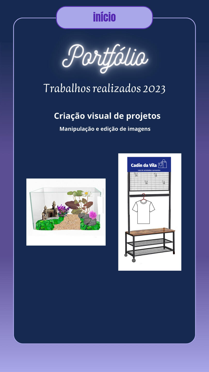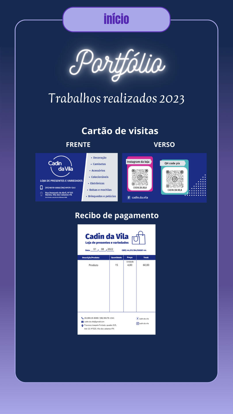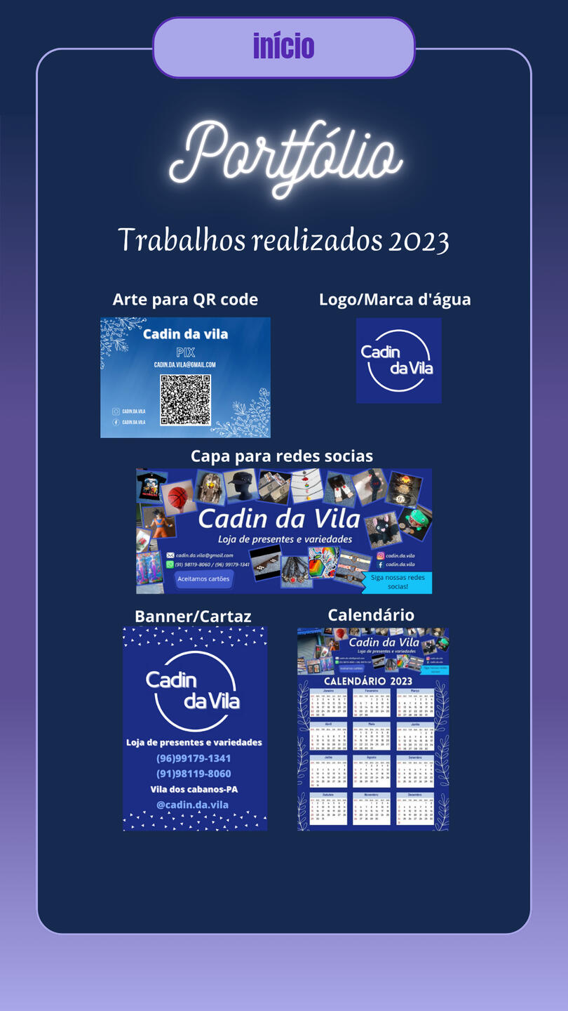 Brand Designer for Cadin da vila, a gift and variety shop, including (Banner/Poster, QR Code Design, Simple Logo, Calendar, Business Card, Social Media Covers, Watermark, Payment Receipt, Social Media Ads, Promotional Posts for Social Media, Videos for Social Media).Designer of business cards, banners, posters, announcements, etc., used for promoting stores and various services.Creation of covers for books and various e-books. Comic creation projects “JORNAL ONLINE” and “VIAGEM AO LIMBO,” including (Character Design, Illustration, Story and Narrative Creation, Editing, Assembly, and Image Manipulation).Digital illustration of characters for personal and commercial use, reference sheets, mascots, comic characters, RPG characters, game characters, custom icons, personalized artwork, furry illustration (mascot), custom wallpapers, etc. Illustration projects for PNGtubers and Vtubers, including creation, illustration, and character design
