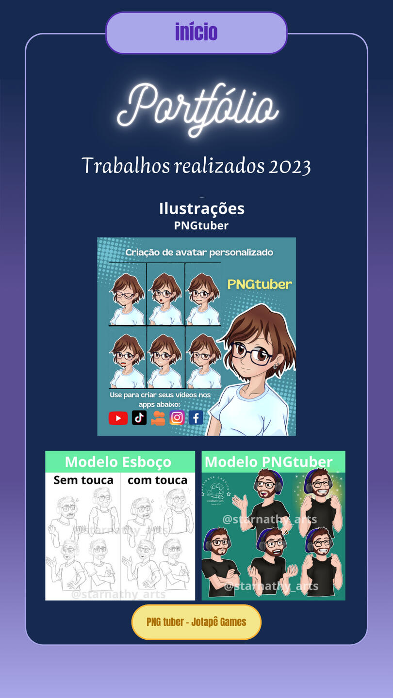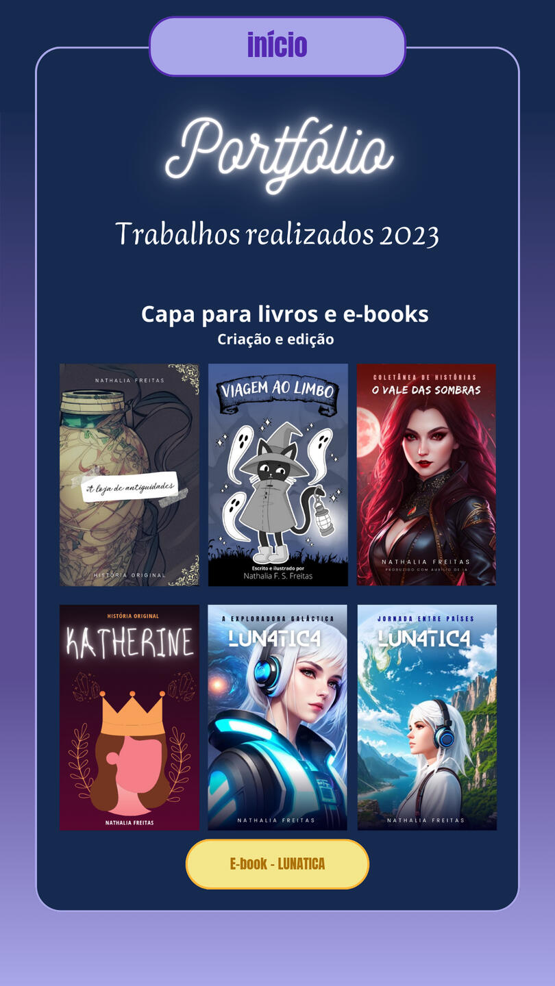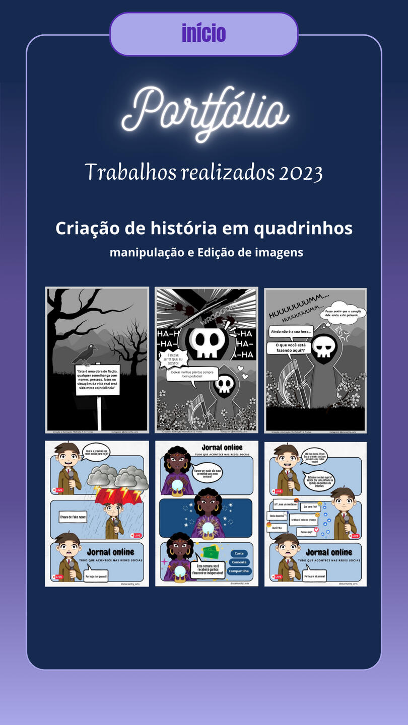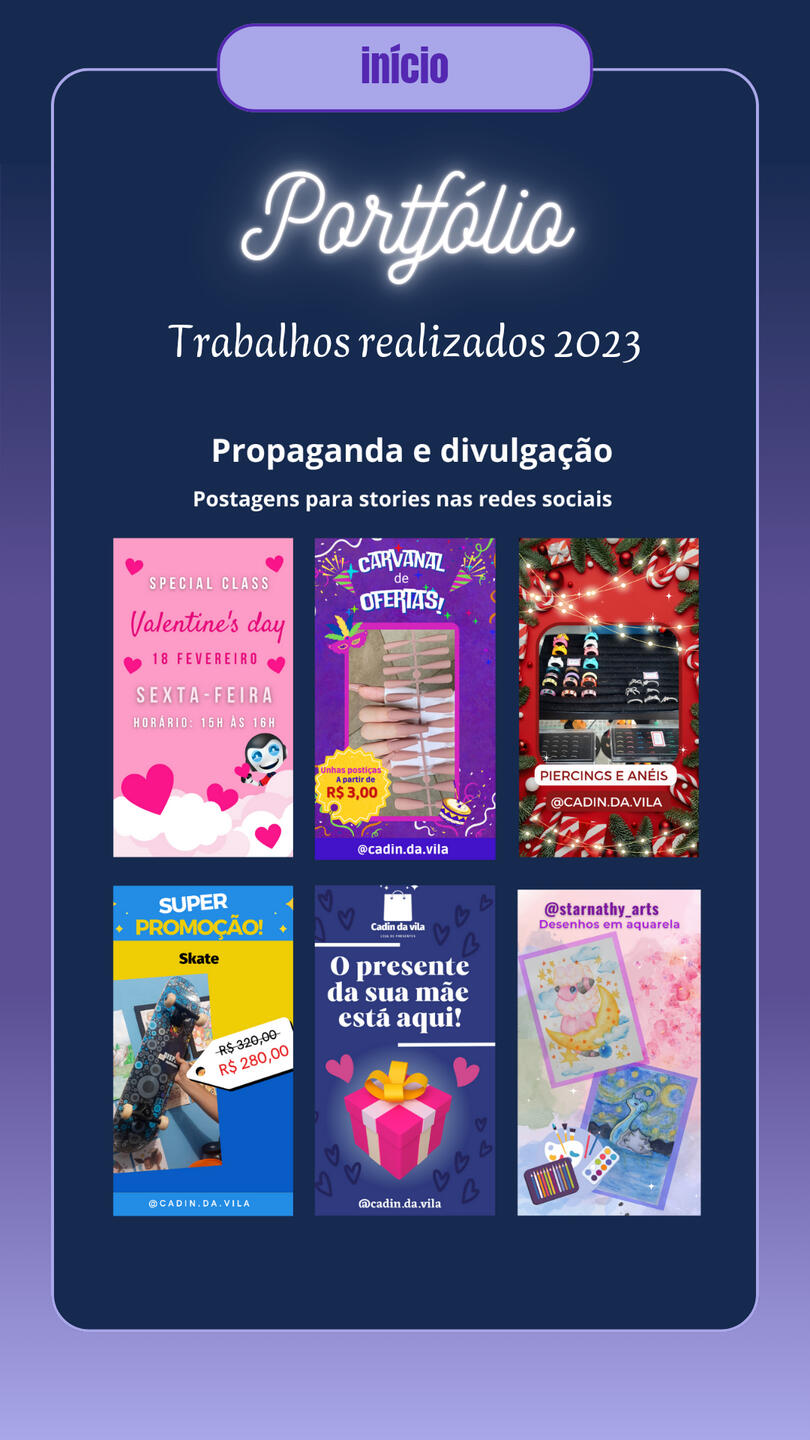 Brand Designer for Cadin da vila, a gift and variety shop, including (Banner/Poster, QR Code Design, Simple Logo, Calendar, Business Card, Social Media Covers, Watermark, Payment Receipt, Social Media Ads, Promotional Posts for Social Media, Videos for Social Media).Designer of business cards, banners, posters, announcements, etc., used for promoting stores and various services.Creation of covers for books and various e-books. Comic creation projects “JORNAL ONLINE” and “VIAGEM AO LIMBO,” including (Character Design, Illustration, Story and Narrative Creation, Editing, Assembly, and Image Manipulation).Digital illustration of characters for personal and commercial use, reference sheets, mascots, comic characters, RPG characters, game characters, custom icons, personalized artwork, furry illustration (mascot), custom wallpapers, etc. Illustration projects for PNGtubers and Vtubers, including creation, illustration, and character design
