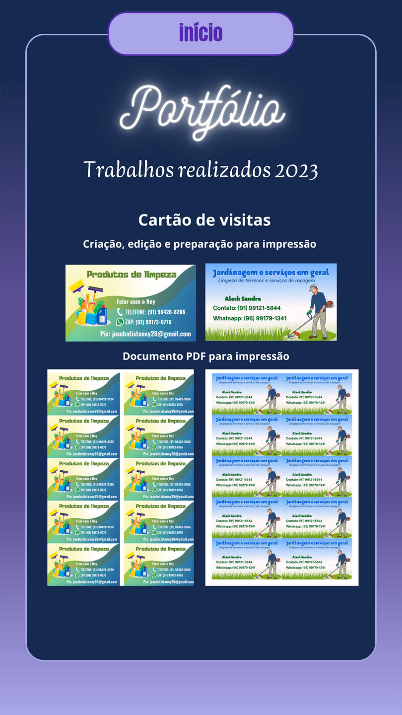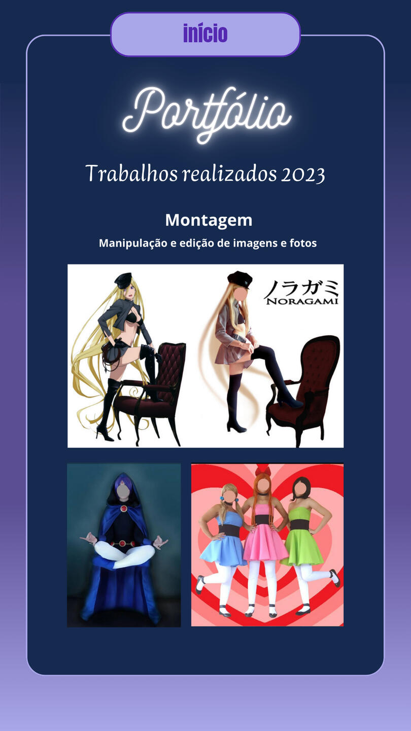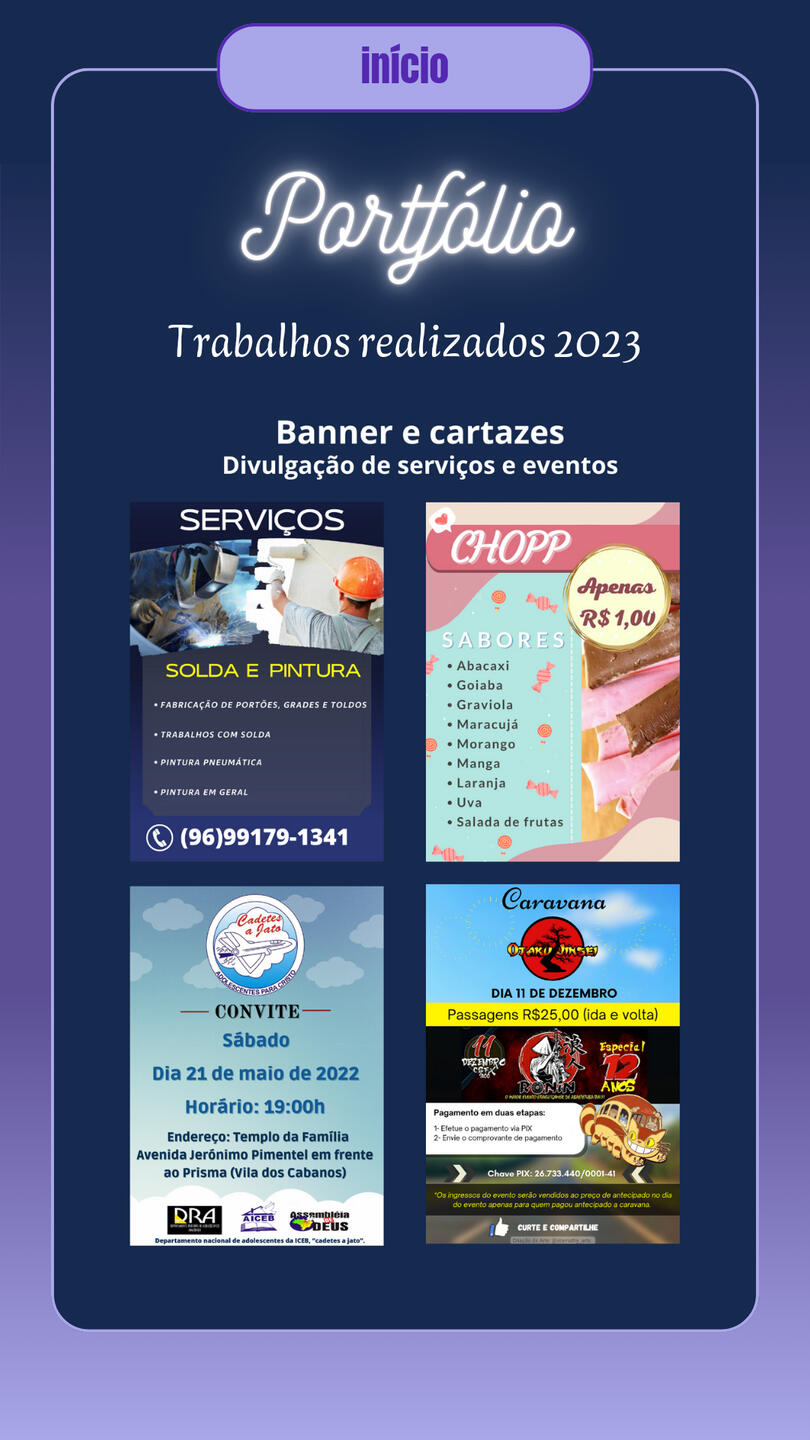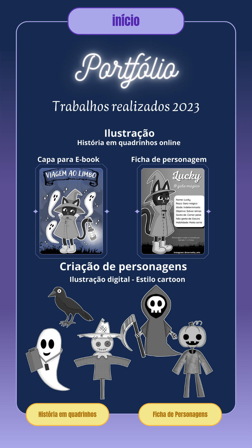 Brand Designer for Cadin da vila, a gift and variety shop, including (Banner/Poster, QR Code Design, Simple Logo, Calendar, Business Card, Social Media Covers, Watermark, Payment Receipt, Social Media Ads, Promotional Posts for Social Media, Videos for Social Media).Designer of business cards, banners, posters, announcements, etc., used for promoting stores and various services.Creation of covers for books and various e-books. Comic creation projects “JORNAL ONLINE” and “VIAGEM AO LIMBO,” including (Character Design, Illustration, Story and Narrative Creation, Editing, Assembly, and Image Manipulation).Digital illustration of characters for personal and commercial use, reference sheets, mascots, comic characters, RPG characters, game characters, custom icons, personalized artwork, furry illustration (mascot), custom wallpapers, etc. Illustration projects for PNGtubers and Vtubers, including creation, illustration, and character design