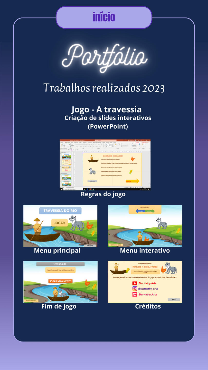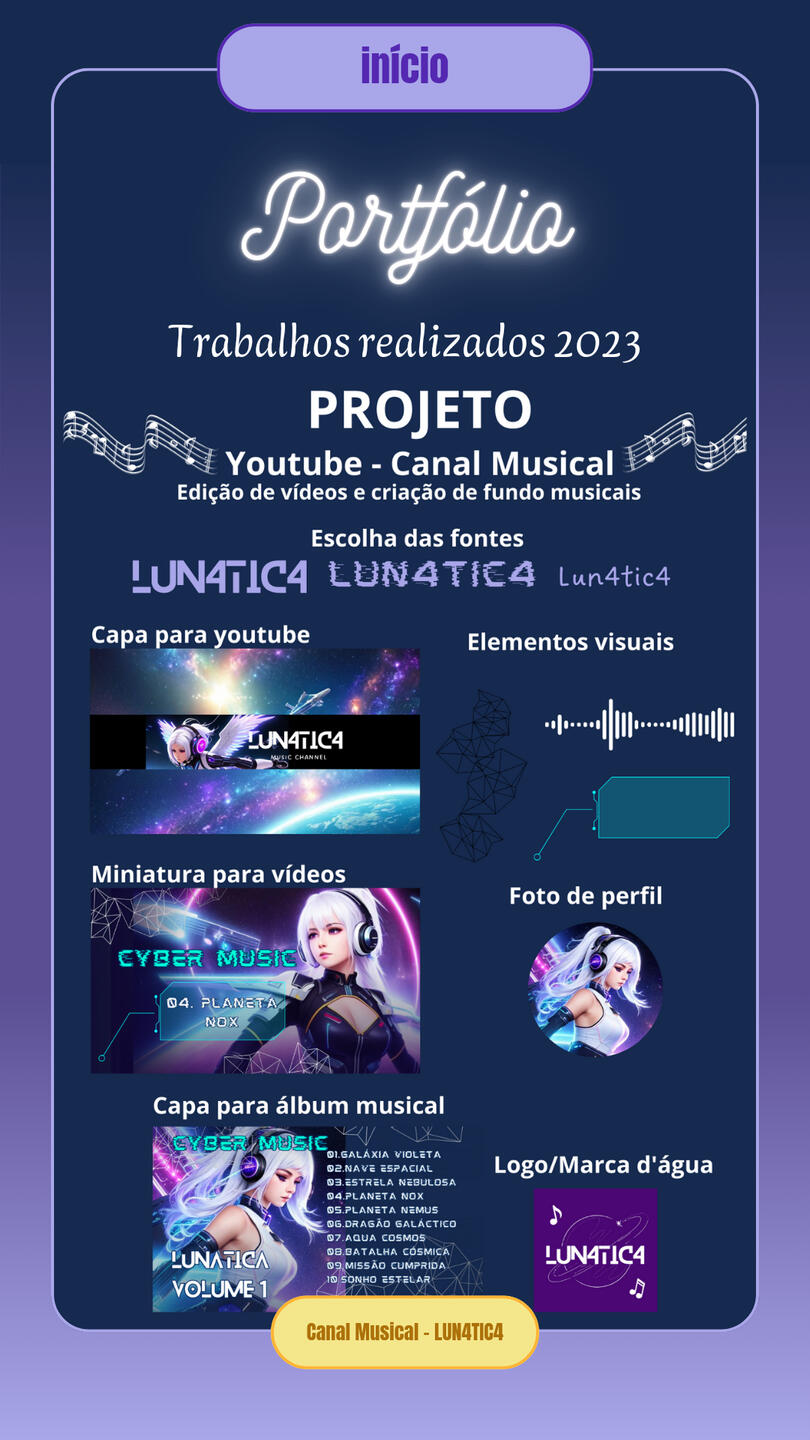 Tuvu Jean_747 Jotapê Games, Luna.Vtuber.Oficial.Project – Musical YouTube Channel, including creation of copyright-free background music, YouTube banner, video thumbnails, profile image, album cover, simple logo, and watermark (character images generated using AI). Visit the channel LUN4TIC4.Digital game development projects, educational games for the PowerPoint platform for teaching use, entertainment games, and brand promotion games on the platform itchi.io.Creation and programming of Visual Novel-style digital games.