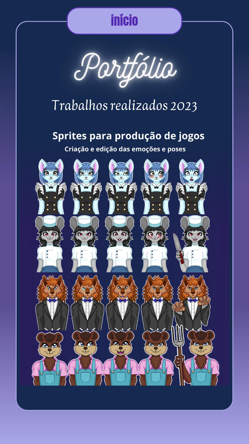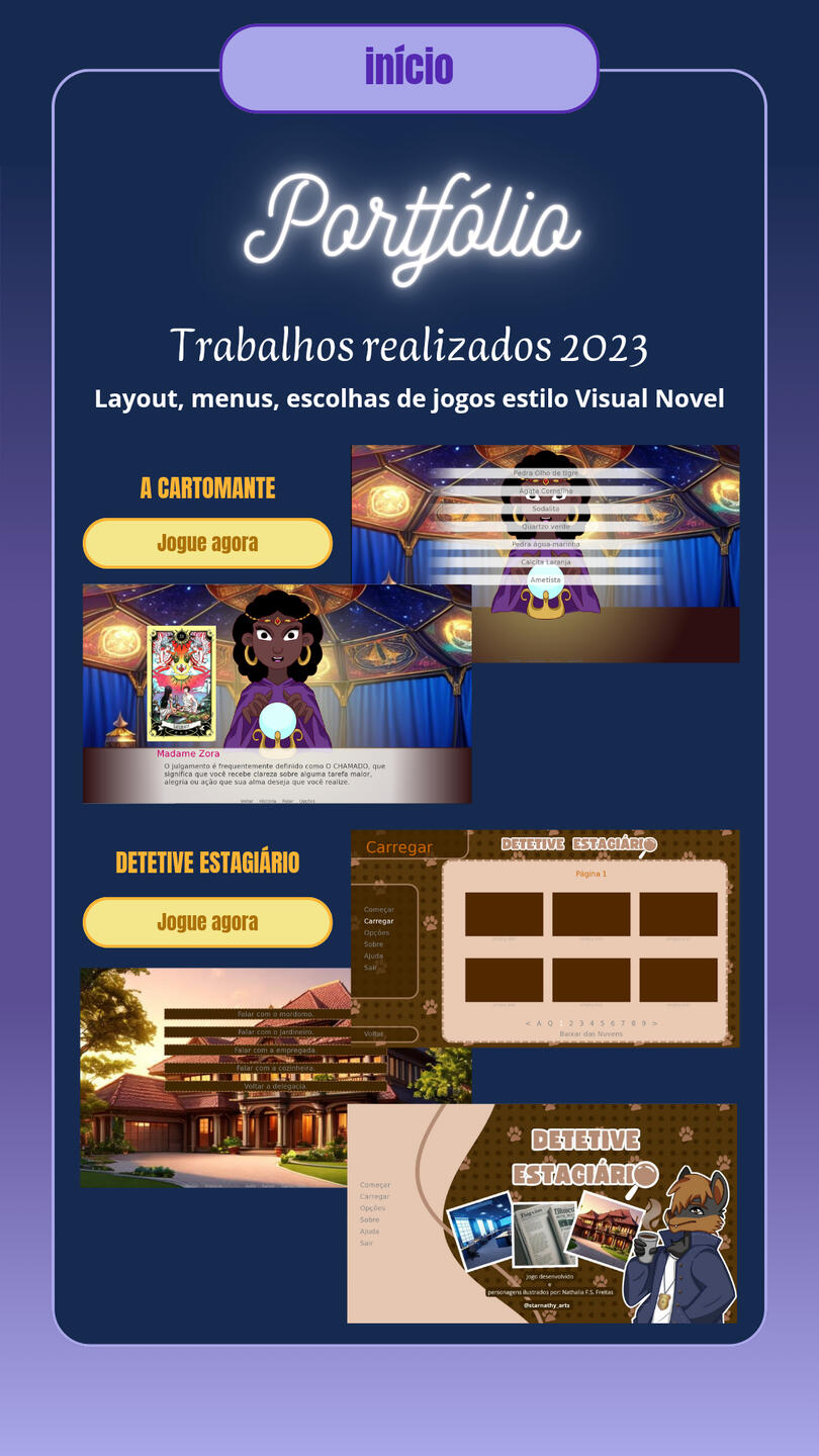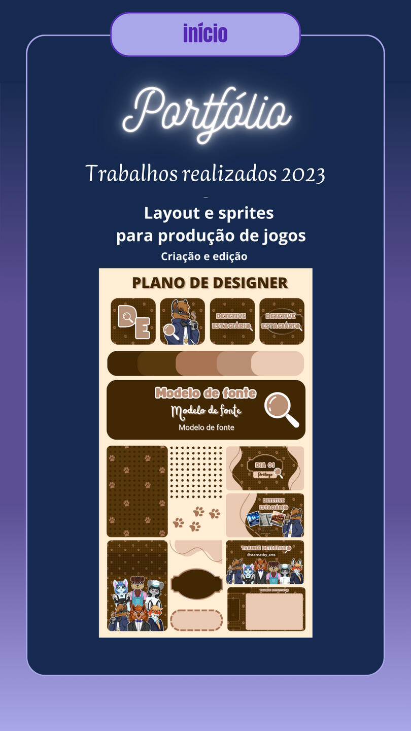 Character sprite models (Visual Novel) developed for the games Detetive Estágiario and A Cartomante.Illustration of layouts and HUBs for digital games in general.